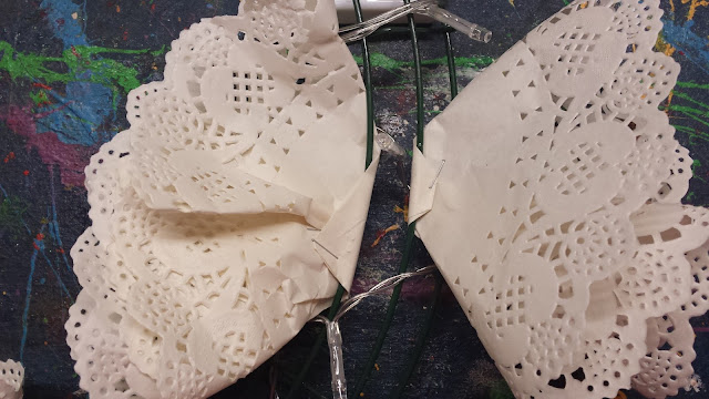 Once you have the idea in your head, there are lots of variations to be made. You could colour the doily's or buy coloured ones. You could spray glitter on it, use coloured lights or try adding lacy cupcake holders. You could use crêpe paper or source some other types of doily's not stocked at my local $2 shop.